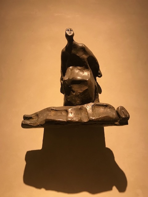 The third is a contemporary, bronze sculpture, hanging on the wall, by Jorge Oteiza of a woman standing bent forward slightly over an unidentified body, head turned to look up at something or someone. The title is “Piety”, yet there is nothing pious in the woman’s stance to me. I may be mistaken but for me her posture, the angle of her head, both, proclaim belligerence, defiance, resistance to the forces behind the death at her feet. Rage and rebellion radiate from her figure.